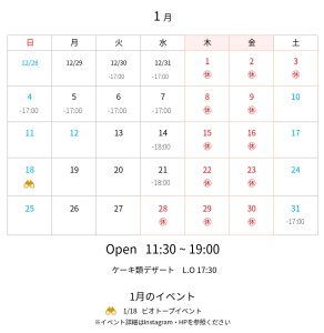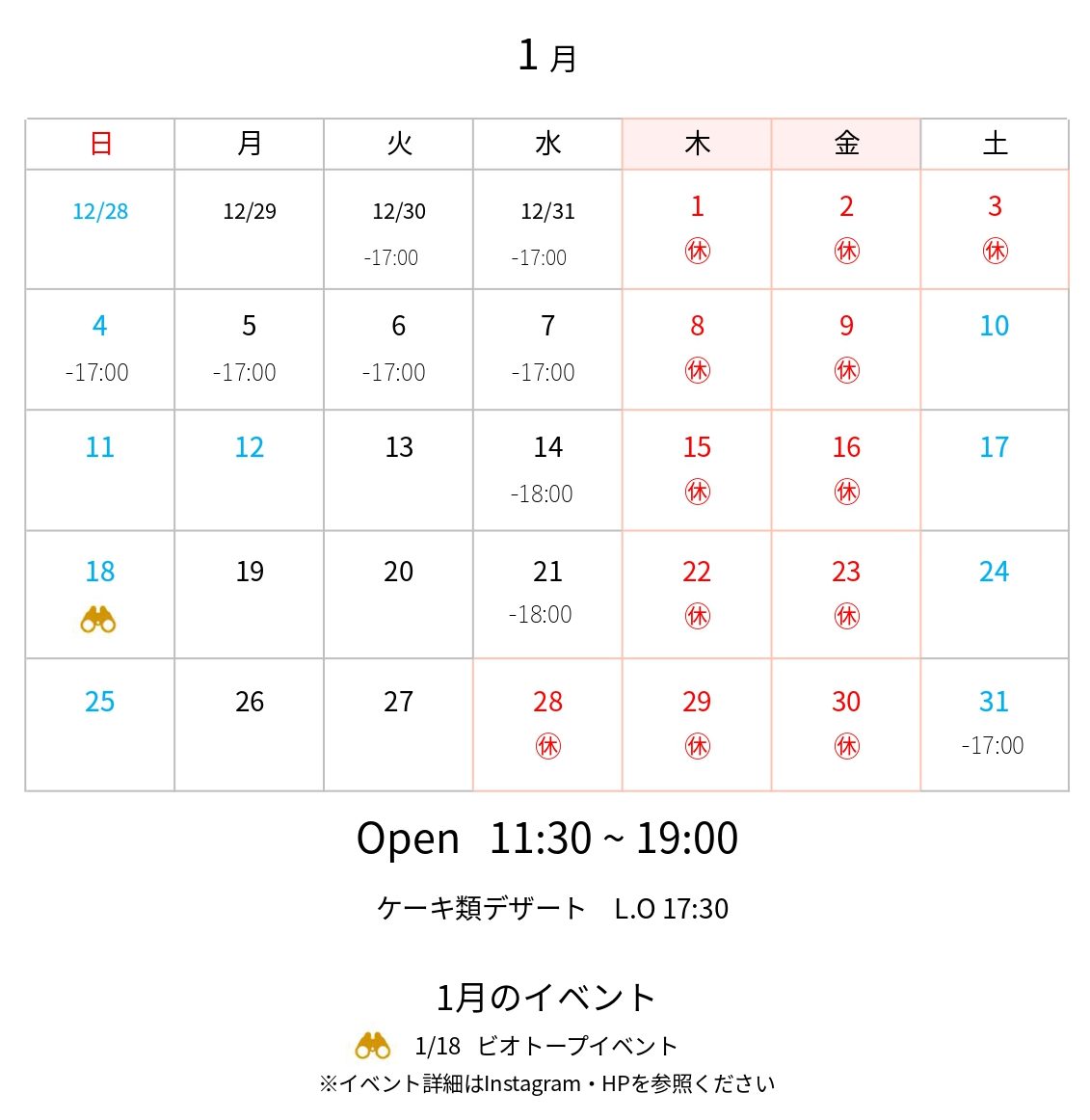 お知らせ 1月の営業予定 2025-12-30 2025年も残すところ僅かとなりました。 本年中はたくさんの方にご利用いただきまして誠にありがとうございます。 1月初め、そして最終の水曜日にお正月休みをいただきます。 また初めの1週間は17時までの時短営業となっています。 お間違えの無いようにお願いいたします。 2026年もどうぞよろしくお願いいたします。